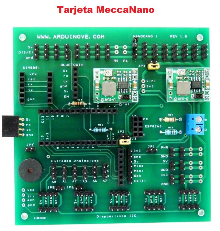 En la foto siguiente, se presenta el Módulo MeccaNano Básico con la Tarjeta Arduino Nano instalada.