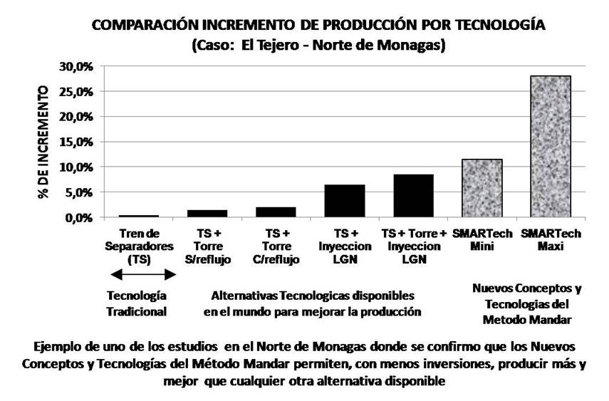 ¿Podrías detallar o cuantificar estos logros, valorizarlos? Si aplicamos a una misma extracción de petróleo, estos Nuevos Conceptos en unas áreas estratégicas del Norte de Monagas, se lograría simultáneamente: 1) Duplicar el incremento de la producción 2) Subir de 7 puntos el ºAPI de los crudos 3) Producir más de los mal llamamos “Líquidos de Gas”, sin las muy costosas inversiones tradicionalmente requeridas ¿Resulta?: Un incremento de 23% del valor de la producción Además como consecuencias y sin inversiones adicionales, se lograría: 4) Incrementar en 12% las reservas accesibles ≈0,9MMMUS$ 5) Eliminar las importantes perdidas a la atmósfera 6) Eliminar las perdidas en las mezclas de crudos ≈1MMMUS$/año 7) Minimizar las contaminaciones 8) Mejorar la cesta nacional ≈1MMMUS$/año 9) Permitir una optimización pluri-áreas 10) Tener flexibilidades operativas y comerciales 11) Mejorar los ºAPI, estabilización, acidez, humedad de los crudos 12) Reducir las infraestructuras 13) Evitar numerosas corrosiones 14) Incrementar la disponibilidad de gas 15) Reducir la ocupación de los suelos 16) Mas seguridad, mantenabilidad, disponibilidad, operatividad, menos vulnerabilidades 17) Y más ¿Globalmente?: incremento de los ingresos de 7MMMUS$/año